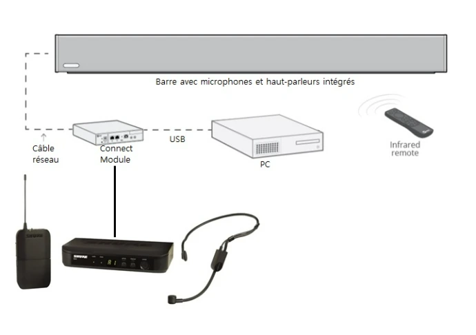 L'intégration du ou des microphones orateur avec les barres permet de renforcer la parole localement tout en optimisant la qualité transmise simultanément en visioconférence.