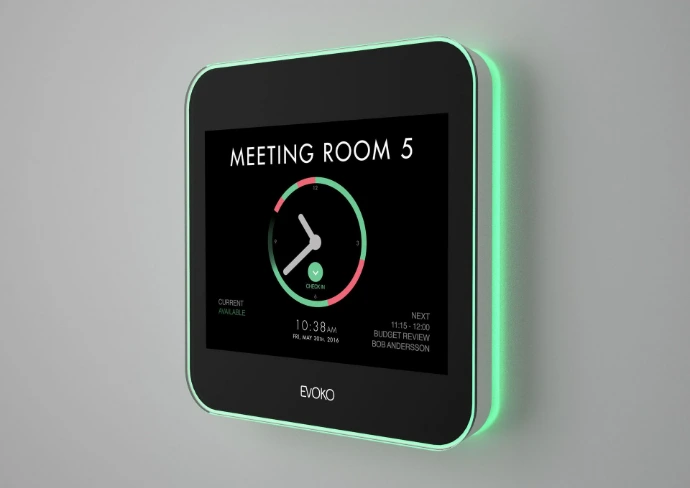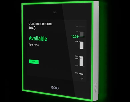 Evoko est une solution d'écrans tactiles de réservation de salle, à placer à l'entrée d'une salle de réunion.